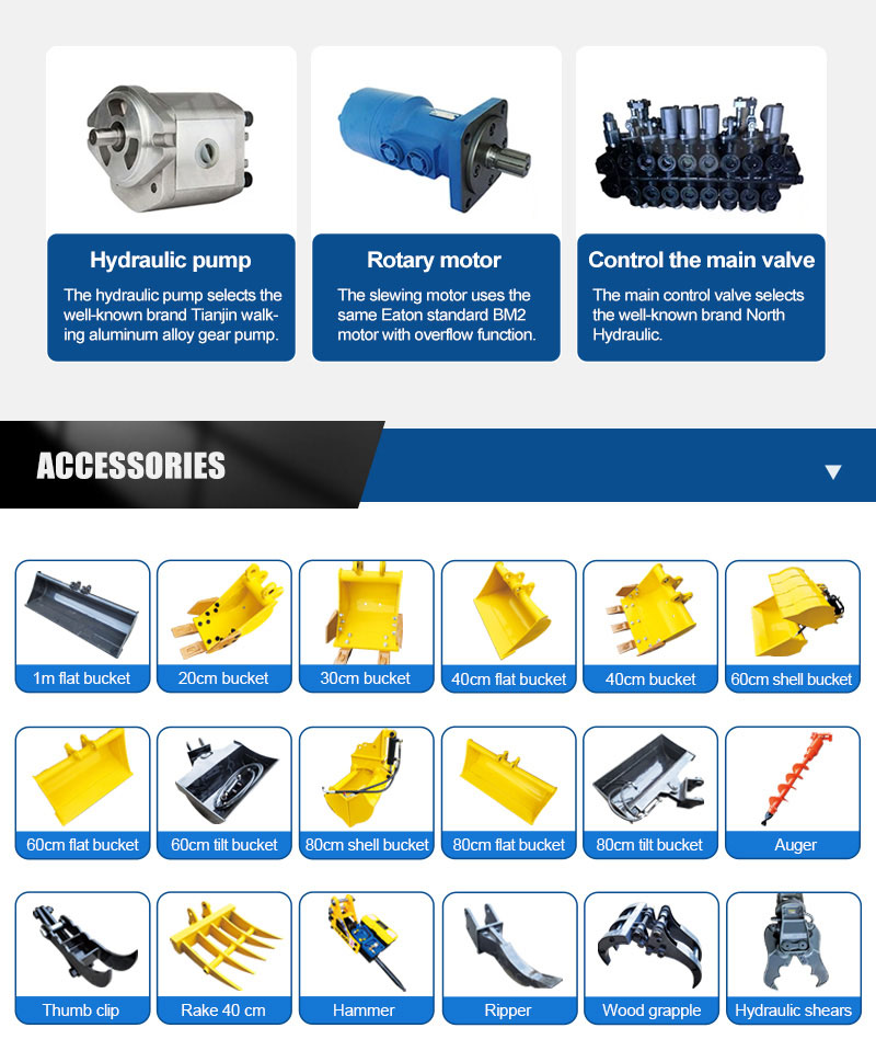 Nowa minikoparka 1,5 t, chociaż korpus jest mały i wykwintny, ale można ją również wyposażyć w różnorodne akcesoria, takie jak mikrochwytak, świder, młot hydrauliczny, wąska łyżka, płaska łyżka itp., które mogą realizować różnorodne pracy scenicznej.