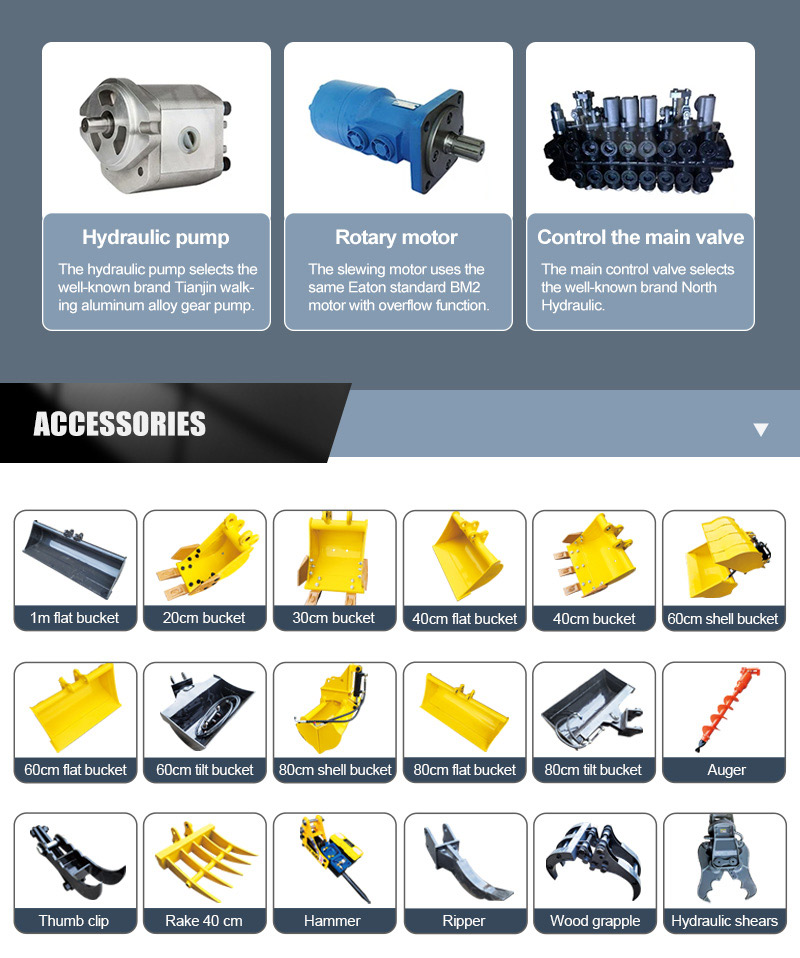 Wreszcie, chociaż nadwozie jest małe i wyrafinowane, można je również wyposażyć w wiele osprzętu, takiego jak mikrochwytak, świdry, młot hydrauliczny, wąskie łyżki, płaskie łyżki i tak dalej.